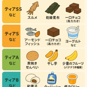 ナッツ類:少量であればティアA。ただし満足感が少なく、食感が良いためつい食べ過ぎやすくカロリー過多になりやすい。
