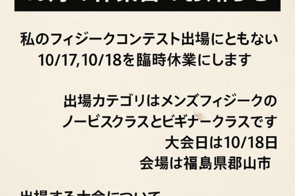 10月休業日のお知らせ|フィジークコンテスト出場のため